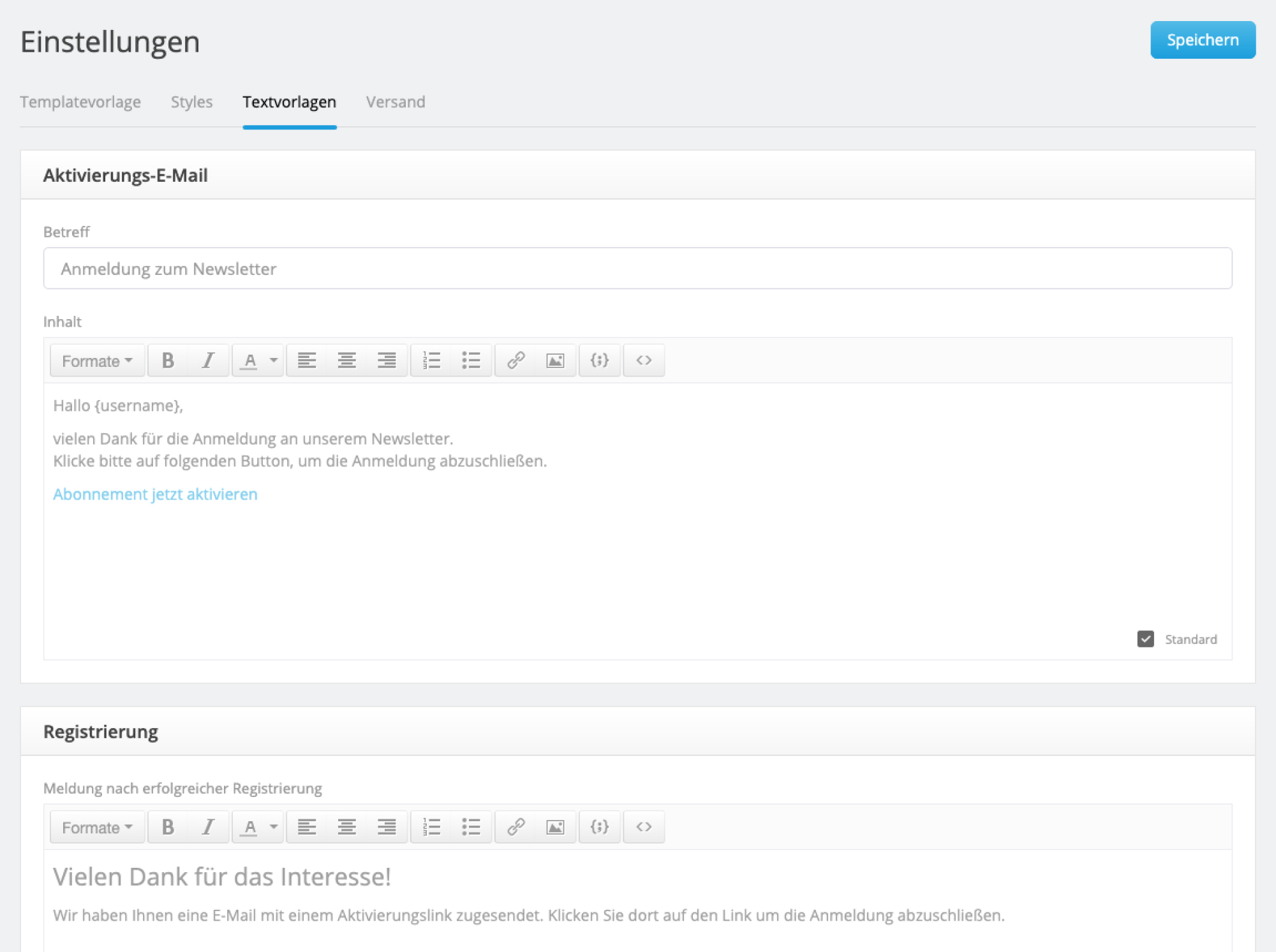 In den Newsletter Einstellungen kannst Du noch Templates vorbereiten, Styles festlegen, Standardantworten hinterlegen und den Versand regulieren.